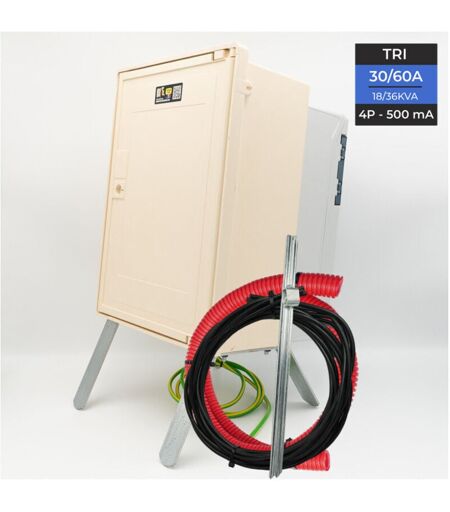 Coffret triphasé 30/60 Ampères 18/36Kws Coffret complet et conforme aux NF-C 14-100/ 15-100 . Caractéristiques techniques : - enveloppe coffret NH 62-S-20 - coffret coupe circuit tétrapolaire 60 Amp taille 00 plombable - disjoncteur d'abonné différentiel AGCP 4P 30/60 500mA plombable NF-C 62-411 - interrupteur différentiel haute sensibilité 4P 63 Ampères 30 mA - boitier IP2X pour interrupteur différentiel - câblage en fil cuivre souple de section 16² avec embouts sertis - emplacement pour fixation du compteur (compteur fourni par le fournisseur d' énergie) - tension de 400 Volts - puissance maxi 60 ampères 36000 watts - 4 prises 16A P+N+T standard domestique - 1 prise 16A 3P+N+T standard CE - 1 prise 32A 3P+N+T standard CE - 2 disjoncteurs P/N 16A courbe C 4.5kA - 1 disjoncteur 4P 16A courbe C 4.5kA - 1 disjoncteur 4P 32A courbe C 4.5kA - 1 piquet de terre d'un mètre - câble de terre d 2 mètres - 3 mètres de câble 4x25² pour le raccordement au réseau - piétement acier galvanisé 3mm ...