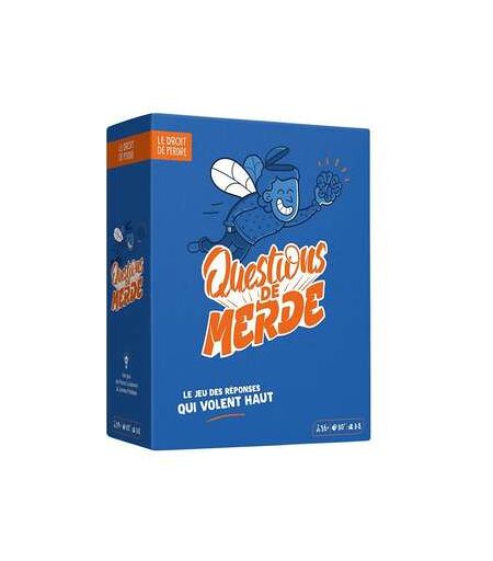 à partir de 16 ans de 3 à 8 joueurs Humour Cartes Aère ton cerveau avec la nouvelle règle de Questions de merde ! Pose une question aux autres, par ex. : Qu'est-ce qui est indispensable pour passer une bonne soirée ? Après chaque réponse, place secrètement le pion du joueur... soit dans le rouleau des réponses qui volent haut : Un repas facile à digérer, Arriver à l'heure... soit dans le rouleau de celles qui ne volent pas haut : Une partouze... À la fin de ton tour, le dernier joueur qui t'a répondu décide quel rouleau gagne ! Ceux qui sont dans le bon rouleau avancent sur le plateau ! ...
