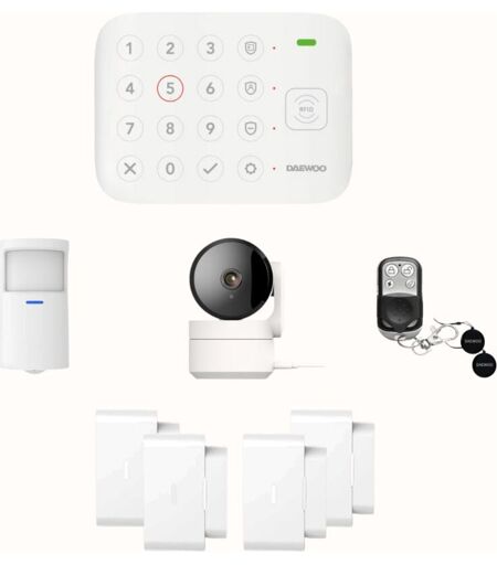 Que comprend le pack alarme VIG101 ? 1 centrale d’alarme Vigilia Wifi : cœur de votre système, connectée en Wifi, votre centrale vous avertit en cas de déclenchement. Dotée d’une sirène intégrée de 90dB, elle alerte le voisinage et fait fuir les intrus. 4 contacteurs 2 en 1 ouverture et choc : à poser sur vos portes, fenêtres ou baies vitrées. Détection à l'ouverture et aux chocs. Une alerte est envoyée en cas de tentative de forçage ou de choc. 1 détecteur de mouvement : idéal pour vos pièces de vie et couloirs. Installation recommandée à 2m10 du sol, incliné de 10° vers le bas. Compatible avec les animaux de moins de 10 kg. 1 télécommande & 2 badges RFID : pour piloter votre système facilement (armement, désarmement, mode maison). 1 caméra intérieure IP506P : pour surveiller votre intérieur depuis l’application Daewoo Home Connect. Votre caméra intérieure rotative IP506P Connectée en Wifi et facile à installer, cette caméra vous permet de surveiller votre domicile en temps réel ...