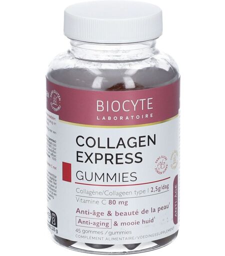 Complément alimentaire à utiliser dans le cadre d’une alimentation variée, équilibrée et d’un mode de vie sain.Biocyte COLLAGEN EXPRESS GUMMIES est un complément alimentaire sous forme de gummies qui apporte une action anti-âge grâce au collagène et à la vitamine C. 3 gommes apportent 2.5 g de collagène. La vitamine C contribue à une fonction normale de la peau. COLLAGEN EXPRESS GUMMIES, c’est le produit idéal pour donner un coup de jeune à votre peau tout en estompant les signes visibles de l’âge.Le collagène est la protéine la plus abondante dans le corps et elle est indispensable à la structure de la peau. Il est l’une des briques essentielles de la peau avec l’acide hyaluronique et l’élastine.A partir de 25 ans, la production de collagène diminue. La peau peut devenir plus relâchée, moins dense et rebondie, et les premiers signes de l’âge peuvent apparaître.Pour limiter ces effets, une supplémentation en collagène peut être bénéfique.Composition:Glutathion liposomal (L-glutathion réduit ; émulsifiant : lecithine de tournesol) ; Amidon de maïs ; Maltodextrine ; Enveloppe de la gélule d’origine végétale (agent d’enrobage : hydroxypropylméthylcellulose ; colorant : carbonate de calcium ; amidon modifié) ; Vitamine C liposomale (acide-L-ascorbique ; émulsifiant : lécithine de tournesol) ; Emulsifiant : sels de magnésium d’acides gras ; Antiagglomérant : talc. Complément alimentaire à base de Glutathion et Vitamine C.Valeur nutritionnelle: Pour 3 gommes Hydrolysat de collagène 2,5 g Vitamine C 80 mg (100 % des VNR*) *VNR : Valeurs nutritionnelles de référence Conseil d'utilisation:3 gommes par jour, de préférence le matin.Précautions d'emploi:Ne pas dépasser la dose journalière conseillée. Tenir hors de portée des jeunes enfants. Déconseillé aux femmes enceintes ou qui allaitent et aux enfants sans l’avis d’un professionnel de santé. Une consommation excessive peut avoir des effets laxatifs. A conserver à une température inférieure à 25°C, dans son emballage hermétiquement fermé, à l’abri de la lumière.Poids net: 135 g = 45 gommesFabricant: Laboratoire Biocyte 1555, avenue de la plaine 06250 Mougins FRANCE ...