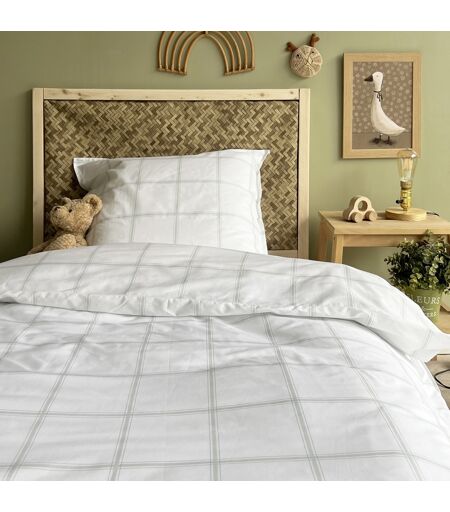 Parure pour lit enfant composée d'une taie d'oreiller et d'une housse de couette 1 personne. Bel imprimé carreaux vert et bleu foncé sur fond blanc. Volant discret sur le contour de la taie. Une ouverture forme bouteille est prévue au pied de la housse de couette pour la border facilement. En percale de coton* 80 fils. Dimensions : taie : 63x63 cm housse de couette : 140 x 200 cm Composition : 100% coton* * coton issu de l'agriculture biologique Conseils de lavage : Lavable en machine à 40°C (pour limiter la consommation d'énergie, privilégiez les basses températures de lavage) Séchage en machine 1 point Imprimée et fabriquée en FRANCE Création exclusive Little Crevette. ...