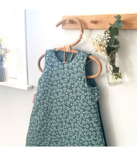 Turbulette mixte en percale de coton bio*, ouatinée pour la mi-saison et l'hiver. Imprimé fleurs et petits lapins sur fond vert foncé. Doublure intérieure unie verte. Composition : extérieur et doublure en percale : 100% coton* (80 fils) garnissage : 100% polyester * coton issu de l'agriculture biologique Type d'ouverture de la gigoteuse : double bouton-pression aux épaules pour bien maintenir bébé zip côté pour une ouverture totale avec cache de protection Utilisation : TOG : 2,5. Cette turbulette peut être utilisée toute l'année dans une chambre chauffée entre 18 et 21° pour des raisons de sécurité, privilégiez l'utilisation d'une gigoteuse jusque 18 mois. N'utilisez ni oreiller, ni couette. AVERTISSEMENT ! Ne pas utiliser si la tête de l'enfant peut passer par l'encolure une fois celle-ci attachée. Veiller à ce que l'encolure et les emmanchures soient correctement attachées. Ne pas utiliser si l'enfant peut grimper et sortir du lit à nacelle. Ne pas utiliser en combinaison avec une couette pour lit à nacelle ou une couverture. Tenir compte de la température de la pièce et des vêtements de nuit portés par l'enfant. Un excès de chaleur peut mettre la vie de votre enfant en danger ! Création exclusive Little Crevette. ...