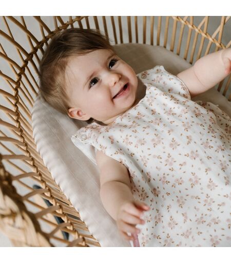 Gigoteuse été non ouatinée en mousseline de coton fond blanc cassé imprimée de petites fleurs roses et caramel. Doublure intérieure blanc cassé. 2 fines épaisseurs de mousseline. Sans ouatinage, elle convient pour l'été. Cache-zip pour plus de confort et de douceur. Son tissu léger et absorbant gaufre au lavage. Pour encore plus de douceur, n'hésitez pas à la passer au sèche-linge ! Composition : extérieur et doublure en double-gaze 100% coton* * coton issu de l'agriculture biologique Type d'ouverture de la gigoteuse : grande ouverture zippée sur le côté pour faciliter l'ouverture totale de la turbulette double boutons-pressions aux épaules pour bien maintenir bébé Utilisation : TOG 0,5 : cette turbulette peut être utilisée dans une chambre entre 21 et 27°C choisissez une taille adaptée à l'âge de votre bébé pour des raisons de sécurité, l'utilisation d'une gigoteuse est vivement recommandée jusque 18 mois. N'utilisez ni oreiller, ni couette pour préserver ses qualités, nous recommandons de laver votre gigoteuse en gaze dans une taie d'oreiller AVERTISSEMENT ! Ne pas utiliser si la tête de l'enfant peut passer par l'encolure une fois celle-ci attachée. Veiller à ce que l'encolure et les emmanchures soient correctement attachées. Ne pas utiliser si l'enfant peut grimper et sortir du lit à nacelle. Ne pas utiliser en combinaison avec une couette pour lit à nacelle ou une couverture. Tenir compte de la température de la pièce et des vêtements de nuit portés par l'enfant. Un excès de chaleur peut mettre la vie de votre enfant en danger ! Création exclusive Little Crevette. ...