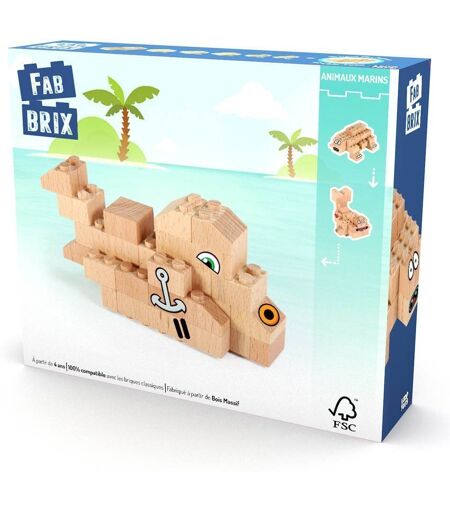 Coffret FabBrix Animaux marins 32 pièces : 30 briques en bois, 2 briques exclusives double-face, une planche de stickers et un guide de construction. Permet de construire un poisson, une tortue de mer, une baleine ou d'autres selon votre imagination. Découvrez les FabBrix : des briques de construction en bois massif, issues de forêts certifiées FSC, 100% compatibles avec les briques de construction classiques. Ajoutez-y ...