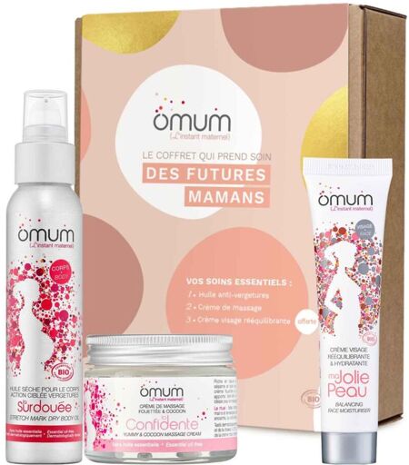 ' Le coffret qui prend soin des mamans ' a été pensé spécialement pour la future ou jeune maman et saura l'accompagner pour prendre soin d'elle ! Doux, sûr et efficace, vous ne pouvez pas vous tromper, elle va adorer ! QUE CONTIENT LE COFFRET ?• Notre huile sèche anti-vergetures LA SURDOUEE. Elle associe l'aloe Vera et 9 huiles végétales 100% BIO, ultra-riches en omégas 3, 6 et 9 pour prévenir activement de l'apparition des vergetures. Elle nourrit durablement la peau, en favorisant sa régénération et en améliorant l'élasticité cutanée.• Notre crème de massage fouettée & cocoon LA CONFIDENTE. Composée de beurre de karité, d'huile de sésame et d'aloe Vera, notre crème fouettée fond au contact de la peau. Elle est idéale pour l'hydrater et soulager les sensations d'inconfort. Délicatement parfumée à la vanille bourbon, c'est un nuage de douceur qui vous fait partager de véritables moments d'émotions lors du massage du ventre de maman, puis du petit corps de bébé. Omum vous accompagne en vous proposant des rituels d'automassages à réaliser à deux ou quatre mains (avec papa !).• Notre crème visage rééquilibrante & hydratante MA JOLIE PEAU. Elle combine dans une formule unique des actifs hydratants, purifiants et sébo-régulateurs pour rééquilibrer la peau parfois capricieuse des futures et jeunes mamans. Grâce aux prébiotiques 100% naturels de de notre soin, l'équilibre cutané est préservé. La peau est nette, lumineuse et en pleine santé !SÉCURITÉLe coffret qui prend soin des mamans d'Omum est composé de cosmétiques certifiés bio spécifiquement formulés pour les femmes enceintes et jeunes mamans. Ils offrent une sécurité maximale pour maman & bébé : une garantie d'innocuité pour la femme enceinte et allaitante évaluée par un expert toxicologue indépendant. Certificat de sécurité délivré pour la femme enceinte & allaitante, formules garanties sans huiles essentielles.Un référentiel cosmétique bio certifié COSMEBIO* et NATURE&PROGRES** excluant tout ingrédient controversé (perturbateurs endocriniens, phtalates, phenoxyéthanol, paraben, sodium laureth sulfate, CMR, etc). Les soins contenus dans ce coffret cadeau sont également lauréats de la mention SLOWCOSMETIQUE, qui défend une cosmétique plus écologique, honnête et éthique, respectueuse des hommes, des animaux et de l'environnement. *La Surdouée et Ma Jolie Peau** La Confidente> LE COFFRET QUI PREND SOIN DES MAMANS PEUT S'UTILISER DÈS LE PREMIER MOIS DE GROSSESSE ET EST COMPATIBLE AVEC L'ALLAITEMENT ...