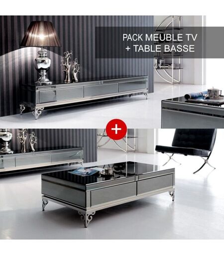Meubler Design - Ensemble Meuble Télé Et Table Basse Elégante, Verre Et Métal, Rectangulaire, Style Baroque, 160 x 40 x 40 cm