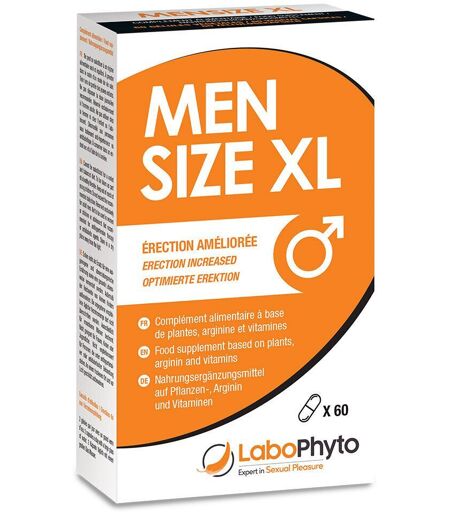 Complément alimentaire à utiliser dans le cadre d’une alimentation variée, équilibrée et d’un mode de vie sain.MenSize XL de Labophyto est un complément alimentaire en gélules destiné à améliorer la fonction érectile et l’épanouissement intime chez les hommes. Enrichi d'une variété d'ingrédients naturels tels que le Mélilot, la Livèche et le Ginseng, ce produit est également une source précieuse de nutriments essentiels pour votre bien-être général.BénéficesAmélioration de la fonction érectile grâce à des ingrédients spécifiques comme le Mélilot et le Ginseng.Soutien de l'équilibre sexuel, la condition physique, la bonne santé des organes reproducteurs et l'endurance, notamment à travers la production de testostérone par le Tribulus.Apports nutritionnels essentiels pour le bien-être général.IngrédientsAntiagglomérant : carbonate de magnésiumEnveloppe de la gélule végétale : hydroxypropylmethylcelluloseExtrait de mélilot (Melilotus officinalis L.)Extrait de livèche (Levisticum officinale)Extrait de shatavari (Asparagus racemosus Willd.)Extrait de ginseng (Panax Ginseng CA Meyer)Extrait de tribulus (Tribulus terrestris)L-arginineAntiagglomérant : sels de magnésium d‘acides grasExtrait de boswellia (Boswellia serrata)Extrait de poivre noir (Piper nigrum)Cyanocobalamine (vitamine B12)Riboflavine (vitamine B2)Valeurs nutritionnelles Pour 2 gélulesExtrait de mélilot (partie aérienne)160 mgExtrait de livèche (racine)100 mgExtrait de shatavari (racine)100 mgExtrait de ginseng (racine)90 mgExtrait de tribulus (fruit)80 mgL-arginine60 mgExtrait de boswellia (gomme résine)20 mgExtrait de poivre noir (fruit)5 mgVit B2 (100% AR)1.4 mgVit B12 (100% AR)2.5 μgConseils d'utilisationPour des résultats optimaux, il est recommandé de prendre 2 gélules de MenSize XL chaque jour pendant une période de trois mois.Précautions d'emploiCe complément alimentaire ne peut être substitué à une alimentation variée et équilibrée. À prendre dans le cadre d’un mode de vie sain. Tenir hors de portée des enfants. Ne pas dépasser la dose journalière recommandée. Produit réservé exclusivement à l’homme adulte. Déconseillé aux enfants, adolescents, femmes enceintes ou allaitantes, femmes ayant des antécédents personnels ou familiaux de cancer du sein ainsi qu’aux personnes sous traitement antihypertenseur ou antidiabétique. À conserver dans un endroit sec et à l’abri de la lumière, de la chaleur et de l’humidité. Pour votre santé, mangez au moins cinq fruits et légumes par jour, pratiquez une activité physique régulière, évitez de manger trop gras, trop sucré, trop salé, évitez de grignoter entre les repas. Poids net60 gélulesAdresse du FabricantLABOPHYTO638 route de VillefrancheLa Buissonnière - RN669480 Anse (FRANCE) ...