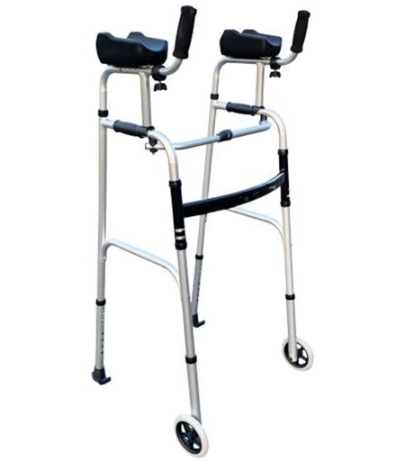Ce cadre de marche pliant dispose de 2 roulettes à lavant 12,5 cm et de patins glissants à larrière pour une déambulation linéaire mais lente. Les 2 appuis brachiaux souples permettent de sappuyer facilement et confortablement. Les poignées sont réglables en profondeur par rapport à lappui en 4 positions de 6 à 12 cm. Structure aluminium. Dimensions : larg. 66 x prof. 53 x haut. des supports 96 à 112 cm en 7 positions. Poids 4,2 kg.Poids supporté maximum : 125 kg ...
