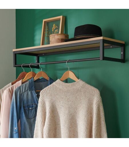 Description générale Chic et pratique, la penderie étagère murale GRIF vous permet de ranger vos affaires tout en suspendant vos vestes et blousons sur des cintres, apportant ainsi une touche déco à votre intérieur. Fabriquée en panneaux de particules mélaminés (PPM), elle se combine parfaitement avec une structure en métal noir . Spécifications techniques Charge maximale : 10 kg Dimensions : L90 x H14,5 x P28,5 cm Épaisseur de la tablette : 15 mm Compatibilité et accessoires Vis de fixation murale non fournies Installation Installer sur un mur solide avec des vis adaptées Suivre les instructions de montage recommandées Utilisation Idéale pour les chambres et les entrées Permet d'adapter la disposition de vos affaires ...