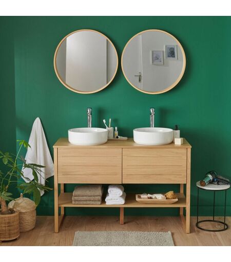 DESCRIPTION GÉNÉRALE Retrouvez notre meuble salle de bain en chêne 120 cm ATOLL accompagné de 2 vasques rondes et de 2 miroirs. Cet ensemble de salle de bain possède un design naturel grâce au bois qui compose le meuble salle de bain. La vasque à poser est fabriquée en céramique pour une simplicité d'entretien et une grande durabilité. Le bois de cet ensemble salle de bain possède le label FSC® C138476 garantissant une gestion responsable des forêts . Robinet, bonde et siphon non inclus. SPÉCIFICATIONS TECHNIQUES Dimensions meuble sous vasque : H78 x L120 x P50 cm Dimensions miroir : Diamètre 80 cm x Profondeur 3 cm / 9 cm Dimensions vasque : Diamètre 37 cm x H 12 cm ...