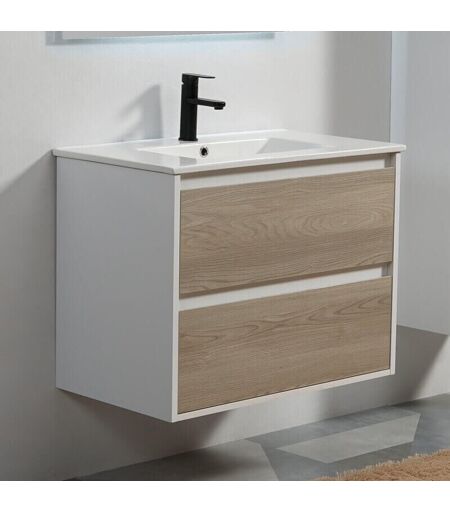RUE DU BAIN Meuble salle de bain 2 Tiroirs Blanc Chêne Gris Vasque 80cm Scandinave