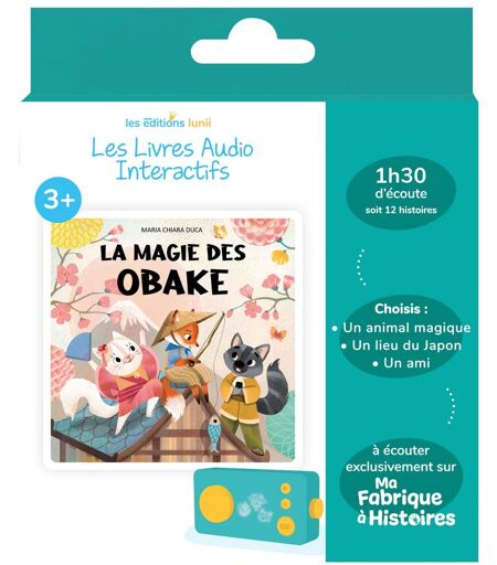 INCLUS : Un coffret audio de 12 histoires à fabriquer pour les enfants dès 3 ans soit 1h30 d'écoute. DES ANIMAUX ET DE LA MAGIE ! Au Japon, il existe des créatures magiques aux pouvoirs magiques qui peuvent se transformer en tout ce qu'ils veulent. Tantôt animal, humain, ogre ou même instrument de musique, voilà la vraie liberté des obake. Avec un tel don, on ne s'ennuie jamais ! COMMENT CA MARCHE ? Ouvrez votre coffret pour récupérez votre code unique de téléchargement. Scannez le QR code et validez l'ajout du livre audio à votre Bibliothèque. Transférez votre livre audio par câble ou via Wi-Fi sur Ma Fabrique à Histoires. MA FABRIQUE À HISTOIRES (non incluse) : Avec Ma Fabrique à Histoires, les enfants choisissent les éléments de leurs récits (un héros, un lieu, un accessoire, un compagnon) et écoutent leurs créations. La vraie boîte à histoires magique, ludique, et éducative ! ...