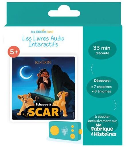 INCLUS : Un coffret audio de 7 scènes et 6 énigmes audio pour les enfants dès 5 ans. 00h37 d'écoute. UN CLASSIQUE DISNEY ! Au c?ur de la savane, les animaux célèbrent la naissance de Simba: l'héritier de Mufasa est né ! Dans l'ombre, Scar fulmine : le lionceau lui a volé sa place. Mais le méchant lion n'a pas dit son dernier mot ! Malin et sans pitié, il est prêt à tout pour écarter Simba et devenir roi de la Terre des Lions. Déjouez les pièges de Scar et aidez Simba à regagner le trône. COMMENT CA MARCHE ? Ouvrez votre coffret pour récupérez votre code unique de téléchargement. Scannez le QR code et validez l'ajout du livre audio à votre Bibliothèque. Transférez votre livre audio par câble ou via Wi-Fi sur Ma Fabrique à Histoires. MA FABRIQUE À HISTOIRES (non incluse) : Avec Ma Fabrique à Histoires, les enfants choisissent les éléments de leurs récits (un héros, un lieu, un accessoire, un compagnon) et écoutent leurs créations. La vraie boîte à histoires magique, ludique, et éducative ! ...