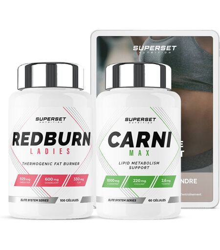 PRÊTE À OBTENIR UN VENTRE PLUS PLAT ? Les coachs sportifs et experts en nutrition Superset Nutrition t’ont préparé ce programme all-in-one pour mettre toutes les chances de ton côté et t’aider à brûler la graisse abdominale afin d’obtenir une taille plus fine. Suis-le pendant les 4 prochaines semaines pour afficher une silhouette affinée et un ventre plat. Tu y trouveras le guide d’utilisation de tes compléments ainsi que tes plans nutritionnel et d’entraînement. LES PRODUITS DU PROGRAMME MINCEUR EXTRÊME DE SUPERSET NUTRITION Ton objectif ici est de favoriser le déstockage des graisses abdominales pour obtenir un ventre plat et affiner la silhouette. REDBURN LADIES (100 CAPS) Spécialement conçu pour les femmes, oxyde les graisses efficacement grâce à son action thermogénique. Contribue également à éliminer la rétention d’eau et calmer les fringales. CARNI MAX (60 CAPS) Intensifie l’action du Redburn Ladies et favorise l’oxydation et le déstockage des graisses. UN GUIDE D'UTILISATION DE TES PRODUITS SPÉCIFIQUE À SUIVRE JOUR APRÈS JOUR Tu verras, suis les indications ci-dessous et affiche une silhouette affinée et tonique en 4 semaines ! UN E-BOOK POUR ATTEINDRE TON OBJECTIF En plus de tes compléments alimentaires, reçois dans ta boîte mail les plans nutritionnel et d’entraînement qui t’accompagneront dans ta transformation. Réception au format digital par e-mail Un plan alimentaire illustré Sur la base d’une alimentation équilibrée et riche en protéines avec un déficit calorique léger. Réception au format digital par e-mail Un plan d’entraînement illustré Essentiel pour perdre du poids sainement, l’entraînement idéal associe des exercices cardio à des exercices de musculation. ...