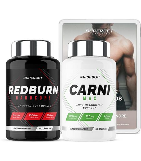 PRÊT(E) À TE CONSTRUIRE DES ADBOS EN BÉTON ? Les coachs sportifs et experts en nutrition Superset Nutrition t’ont préparé ce programme all-in-one pour mettre toutes les chances de ton côté et t’aider à dessiner tes abdos. Suis-le pendant les 4 prochaines semaines pour obtenir une silhouette affinée et tonifiée. Tu y trouveras le guide d’utilisation de tes compléments ainsi que tes plans nutritionnel et d’entraînement. LES PRODUITS DU PROGRAMME MINCEUR EXTRÊME DE SUPERSET NUTRITION Ton objectif ici est de favoriser le déstockage des graisses abdominales pour dévoiler des abdos musclés. REDBURN HARDCORE (100 CAPS) Augmente la thermogénèse et la dépense énergétique pour un déstockage des graisses facilité. CARNI MAX (60 CAPS) Intensifie l’action du Redburn Hardcore et favorise l’oxydation et le déstockage des graisses. UN GUIDE D'UTILISATION DE TES PRODUITS SPÉCIFIQUE À SUIVRE JOUR APRÈS JOUR Tu verras, suis les indications ci-dessous et affiche une silhouette affinée et tonique en 4 semaines ! UN E-BOOK POUR ATTEINDRE TON OBJECTIF En plus de tes compléments alimentaires, reçois dans ta boîte mail les plans nutritionnel et d’entraînement qui t’accompagneront dans ta transformation. Réception au format digital par e-mail Un plan alimentaire illustré Sur la base d’un léger déficit calorique et d’une alimentation riche en protéines pour réduire au maximum le taux de masse grasse tout en conservant la masse musculaire. Réception au format digital par e-mail Un plan d’entraînement illustré Sollicite les différents groupes musculaires de la sangle abdominale pour un renforcement global. ...