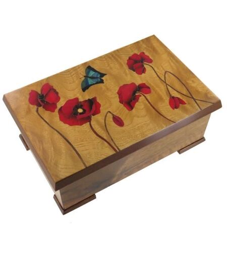 Boîte à musique traditionnelle en bois avec marqueterie coquelicots. Mécanisme musical à ressort de 18 notes. Mélodie: Le lac des cygnes. Dimensions: 18,5 X 12,5 X 7 cm. Autres mélodies disponibles, nous contacter. Encyclopédie: une boîte à musique est un instrument de musique mécanique dont l'organe musical est constitué d'un ensemble de lames d'acier. ...