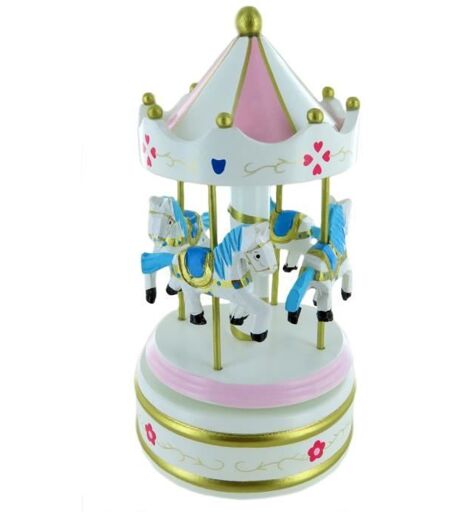 Carrousel musical miniature rose et blanc de grande taille en bois entièrement peint à la main. Les chevaux du carrousel musical miniature tournent au son de la mélodie après remontage de son mécanisme musical par le chapiteau. Ce carrousel musical miniature est doté d'un mécanisme musical traditionnel à ressort de 18 notes. ...