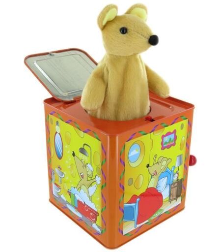 Diable en boîte / Jack in the box avec souris en tissu dans une boîte à musique à manivelle orange en métal chromolithographié. Mélodie: Pop! Goes the Weasel. Dimensions de l'objet fermé: 15,5 X 13,5 X 13,5 cm. Ce jouet à remonter est un classique qui surprendra les enfants à partir de 24 mois. Découvrez l'histoire de ce jouet mécanique dans la description. ...