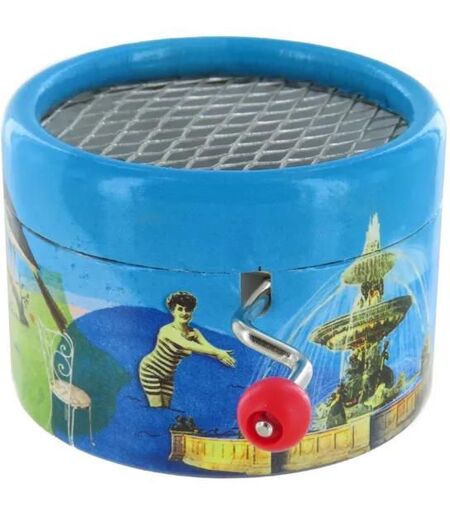 Cette boîte à musique à manivelle ronde en carton renforcé et illustrée est dotée d'un mécanisme musical de 18 notes qui joue la mélodie de la chanson enfantine A la claire fontaine (anonyme). Elle mesure 8 X 5,8 X 4,3 cm et est de couleur bleue. Cette boîte à musique convient aux adultes et est fabriquée en Chine. ...