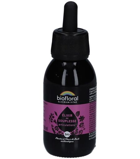 Complément alimentaire à utiliser dans le cadre d’une alimentation variée, équilibrée et d’un mode de vie sain.Une association unique pour le soin naturel de vos articulationsL'Elixir de Souplesse bio de Biofloral est une synergie singulière de plantes et de Fleurs de Bach, agissant en harmonie pour une action globale sur le corps et l'esprit, en vue de soutenir le confort articulaire.Fabriqué en Auvergne et certifié bio, ce complément alimentaire est spécialement pensé pour les personnes, du sportif du dimanche au sportif confirmé, cherchant à apaiser les inconforts articulaires.Les Fleurs de Bach interviennent sur le plan émotionnel et sont préparées selon la méthode originale du Dr Edward Bach. Les plantes ciblent davantage les aspects physiologiques de l'organisme. Cette double action offre une prise en charge holistique de votre bien-être.Pourquoi choisir cet élixir ?• Pour le soulagement et le bien-être : une synergie de plantes comme la Reine-des-prés, la Prêle des champs et l'Harpagophytum, qui sont reconnus pour contribuer à un confort articulaire et une meilleure mobilité.• Pour une utilisation quotidienne agréable : le sirop de sureau et le miel ajoutent une note agréable pour un usage facile et quotidien.Focus sur les Fleurs de Bach incluses :• N°18 Impatiens (Impatience) : contribue à faire les choses sans précipitation et à respecter les limites de son corps.• N°15 Holly (Houx) : encourage une ouverture d'esprit vers les autres.• N°3 Beech (Hêtre) : favorise une plus grande souplesse d'esprit.• N°27 Rock Water (Eau de Roche) : aide à se délester du perfectionnisme.• N°22 Oak (Chêne) : contribue à canaliser l'énergie et à savoir se ménager.Les atouts de ce format :• Saveur agréable grâce au sirop de sureau et au miel.• Conservation optimale dans un flacon en verre opaque.• Pratique, un flacon équivaut à 20 jours de prise, durée recommandée pour un rééquilibrage global de l'organisme.IngrédientsExtrait hydroalcoolique glycériné de plantes* : eau, glycérine*, alcool*, harpagophytum* (Harpagophytum procumbens) 1000 mg, prêle des champs* (Equisetum Arvense), reine des prés* (Filipendula ulmaria); sirop de sureau* : sucre*, eau, sureau noir* (Sambucus nigra), miel*; concentré de jus de pomme*; élixirs floraux de Fleurs de Bach* : Cognac 27°**, Impatiens* (Impatiens glandulifera), Holly* (Ilex aquifolium), Beech* (Fagus sylvatica), Rock water* (aqua e saxo), Oak* (Quercus robur).*Ingrédients issus de l’agriculture biologique et **biodynamique.Conseils d'utilisationÀ partir de 18 ans : 5 ml par jour soit 1 cuillère à café ou 100 gouttes pendant 20 jours.Précautions d'emploiNe pas dépasser la dose recommandée. Ne pas utiliser chez les femmes enceintes, allaitantes, ni par les moins de 18 ans. Déconseillé chez les personnes sous traitement anticoagulant ou allergiques aux dérivés salicylés. Déconseillé en cas d'insuffisance cardiaque ou rénale oedémateuse. Ne pas utiliser en cas d'ulcère gastrique ou duodénal ou de calculs biliaires. Demandez... ...