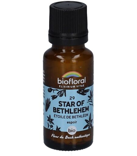 Complément alimentaire à utiliser dans le cadre d’une alimentation variée, équilibrée et d’un mode de vie sain.La fleur de l'apaisement émotionnelVous sentez-vous par moments submergé par des émotions ou des événements marquants, cherchant un ancrage ou une étoile pour vous guider ?La Fleur de Bach 29 Star of Bethlehem - Étoile de Bethléem en granules bio de Biofloral joue un rôle dans l'apaisement de votre coeur.Dans un univers où les chocs émotionnels peuvent parfois perturber notre sérénité, la Fleur de Bach Star of Bethlehem se présente comme un phare lumineux, illuminant notre chemin intérieur et rappelant la résilience et la force intérieure qui résident en nous.Pratique, ce format vous permet de profiter des Fleurs de Bach sous forme de granules sans alcool. Inspirée de la méthode originale du Dr Edward Bach et formulée de façon artisanale, cette préparation est une option idéale pour ceux qui choisissent de ne pas consommer d’alcool. Ce britannique a mis en lumière le rôle essentiel des essences florales pour le bien-être émotionnel. Il a ainsi identifié 38 fleurs, chacune ciblant des émotions distinctes.Les avantages de la Fleur Star of Bethlehem - Étoile de Bethléem :La Fleur Star of Bethlehem - Étoile de Bethléem vous accompagne, vous aidant à faire face aux émotions soudaines et aux bouleversements émotionnels, tout en favorisant un sentiment de prise de recul et de réconfort intérieur. Elle intervient doucement, rappelant l'importance de se reconnecter à soi, vous invitant à vivre chaque moment avec confiance et sérénité.Changements positifs :• Participe à l'appréhension des émotions fortes, vous aidant à retrouver votre équilibre intérieur.• Aide à embrasser les moments présents, ouvrant votre coeur à l'acceptation et la compréhension.La Fleur de Bach 29 Star of Bethlehem - Étoile de Bethléem peut vous soutenir dans votre quotidien, vous offrant une étoile guide à travers les élixirs floraux, une approche adaptée à vos émotions.IngrédientsSucre de canne*, imprégné de préparation à la Fleur de Bach* : Star of Bethlehem (Ornithogalum umbellatum) à 1/240e selon la méthode originale du Dr Bach.*Ingrédients issus de l’agriculture biologique.Conseils d'utilisation3 à 4 granules à laisser fondre dans la bouche ou dans un verre d’eau. 4 fois par jour, pendant 1 à 4 semaines.Précautions d'emploiNe pas dépasser la dose recommandée. Ne se substitue pas à un régime alimentaire varié et équilibré ni à un mode de vie sain. Tenir hors de la portée des jeunes enfants.Poids net19,5 gAdresse du FabricantLaboratoire Biofloral43260 St-Pierre-EynacFrance ...
