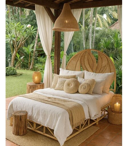 Le motif végétal délicatement travaillé de la tête de lit Rimba transforme instantanément la chambre en un refuge poétique et apaisant. Son grand format (L 160 cm x P 10 cm x H 150 cm) et sa silhouette en arche revisitent l'esprit bohème avec une touche exotique, tout en restant légère visuellement grâce aux contours ajourés. Entièrement fabriquée en rotin naturel, Rimba se distingue par ses feuilles tressées à la main qui jouent subtilement avec la lumière, créant de jolis jeux d'ombres pour une ambiance chaleureuse. Facile à installer, cette tête de lit se glisse derrière le sommier et se cale tout simplement contre le mur, sans besoin de fixation. Elle devient alors la pièce maîtresse de la chambre : idéale pour un lit double dans une maison de vacances, une chambre d'amis ou une suite parentale qui invite à l'évasion. L'esprit Rimba : Sauvage, bohème et poétique La tête de lit Rimba célèbre l'inspiration tropicale et artisanale du rotin. Chaque détail du motif > ...