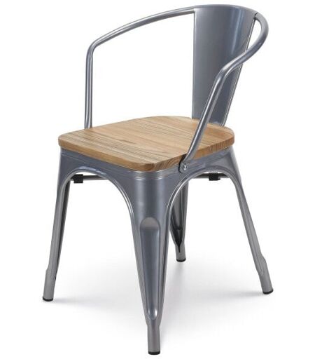Kosmi - Chaise en métal silver style Industriel et assise en bois naturel clair - Avec accoudoirs