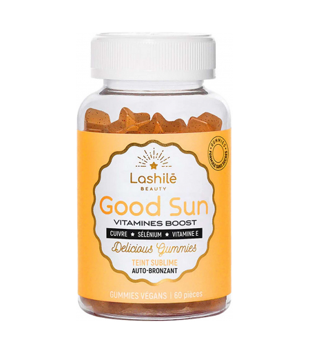 Les gummies sont des petites gommes à mâcher fruitées aux allures de bonbons, aux formes et couleurs diverses, qui rendent la prise de compléments alimentaires très ludique ! Lashilé Beauty est une marque française qui propose des compléments alimentaires à base d'actifs végétaux, végan, sans colorants artificiels et non testés sur les animaux. Un teint hâlé toute l'année c'est l'ambition de ces gummies ! Lashilé Good Sun contient des nutriments essentiels pour accélérer et prolonger votre bronzage. Le lycopène est un pigment naturel, parfait pour booster le bronzage ! Excellent antioxydant, il protège la peau des agressions du soleil et stimule la production de mélanine qui est à l'origine du bronzage. Le bêta-carotène est un pigment antioxydant qui filtre la lumière bleue causée par les rayons UV. Elle permet d’augmenter la tolérance au soleil et protège la peau et les yeux contre les UV du soleil. La vitamine E, considérée comme la vitamine de la jeunesse, protège du vieillissement et participe à la nutrition et à l'hydratation de la peau. Le cuivre est un oligo-élément essentiel à notre organisme. Accélérateur de bronzage et antioxydant, il maintient la pigmentation de la peau et des cheveux. Le sélénium est un atout pour lutter contre les signes de l'âge sur la peau. Il protège des coups de soleil, facilite le bronzage et lutte contre les rides et la sécheresse de la peau. De plus, il favorise la beauté des cheveux et des ongles. Goût pêche. ...