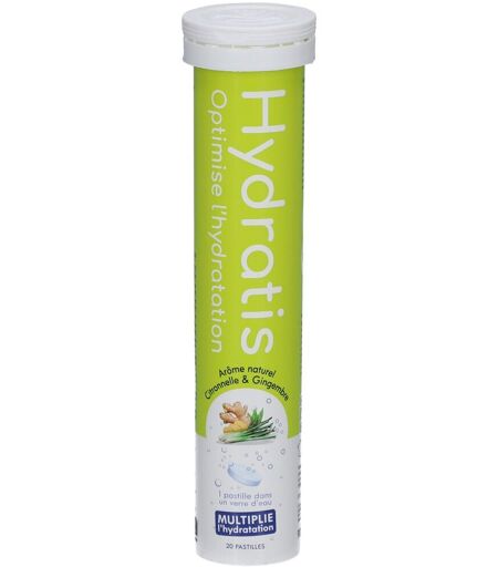 Les compléments alimentaires ne peuvent se substituer à une alimentation variée et équilibrée et à un mode de vie sain.Pastilles isotonique enrichies en électrolytes et oligo-éléments pour améliorer l’hydratation, la concentration, l’énergie et la récupération. Saveur naturelle citronnelle gingembre.IngrédientsAcide citrique, bicarbonate de sodium, dextrose, citrate de sodium, chlorure de potassium, chlorure de sodium, arôme naturel citronnelle/gingembre, extrait de betterave, gluconate de zinc, gluconate de cuivre, édulcorant : glycosides de stéviol, sélénite de sodium.Conseils d'utilisationDissoudre 1 pastille dans 250 ml d’eau. Consommer au moins 2 pastilles par jour. Jusqu’à 5 pastilles par jour selon les besoins.Précautions d'emploiNe pas dépasser la dose journalière recommandée. Tenir hors de portée des enfants. Ne se substitue pas à une alimentation variée et équilibrée.Poids net20 pastilles = 82 gAdresse du FabricantHydratis60 Rue François 1er75008 Paris ...