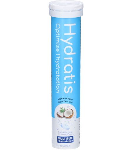Complément alimentaire à utiliser dans le cadre d’une alimentation variée, équilibrée et d’un mode de vie sain.Hydratis est une solution innovante contenant des électrolytes et des oligo-éléments, spécialement conçue pour augmenter l'absorption de l'eau dans votre corps.Les électrolytes sont indispensables pour maintenir l'équilibre hydrique et soutenir votre métabolisme. Sa formule facile à utiliser et extrêmement efficace en fait le choix idéal pour ceux qui cherchent à maintenir une hydratation optimale.Hydratis est adapté à une multitude de situations (bien-être, sport, chaleur, fatigue, hiver, voyage...) et convient à tout le monde, à partir de l’âge de 3 ans (voir recommandations ci-dessous pour les doses adaptées).Soutenez votre hydratation au quotidien pour réduire la fatigue et entretenir une belle peau. Nos pastilles sont également très utiles pour soutenir l'activité physique et limiter les crampes et les courbatures. Elles sont très prisées par les sportifs ainsi que par certaines professions exposées (pompiers, ouvriers du BTP, agriculteurs, ...).Les pastilles Hydratis conviennent à tous, dès l'âge de 3 ans, pour améliorer l'hydratation.N'oubliez pas de bien rester hydraté avec Hydratis en été, pendant les fortes chaleurs, comme en hiver !IngrédientsSucres : dextrose , saccharose ; acidifiant : acide citrique ; bicarbonate de potassium ; sel de magnésium de l'acide citrique ; bicarbonate de sodium ; chlorure de potassium ; arôme naturel ; chlorure de sodium ; édulcorant : sucralose ; citrate de zinc ; sulfate de manganèse.Valeurs nutritionnellesInformations nutritionnelles pour 5 pastillesPotassium 750 mg (38% VNR), Chlorure 450 mg (56% VNR), Sodium 425 mg, Magnésium 162,5 mg (43% VNR), Zinc 5 mg (50% VNR), Manganèse 1 mg (50% VNR)Conseils d'utilisationEnfants 4-10 ans : 1 pastille le matin et 1 pastille dans l'après-midi. L’hydra’stuce : Instaurer la routine d’hydratation au petit déjeuner et au goûter pour optimiser l’hydratation de vos enfants ! 3 pastilles maximum par jour.Adultes +50 ans : 2 pastilles par jour. L’hydra’stuce : Adopter la routine d’hydratation au réveil et avant le coucher pour instaurer le réflexe hydratation ! 3 pastilles maximum par jour.Femme enceinte : 2 pastilles dans 500 mL à boire tout au long de la journée lors des épisodes de nausées et de fatigue (éviter la prise prolongée).Précautions d'emploiVeuillez demander l'avis d'un professionnel de santé pour : insuffisance rénale, diabète, maladies cardio-vasculaires, adultes de +70 ans, enfants de 3-4 ans.Consommer 5 pastilles au maximum par jour. Ne pas dépasser la dose journalière recommandée. Les compléments alimentaires ne doivent pas être utilisés comme substituts d’un régime alimentaire varié et équilibré et d’un mode de vie sain. Il est recommandé de boire au moins 2l d’eau par jour. Conserver dans un endroit frais et sec.Poids net20 pastillesAdresse du FabricantSARL ALTERRA10 rue de Penthièvre75008 ParisFrance ...