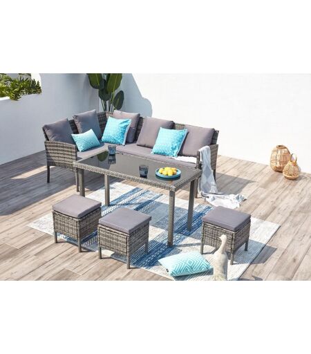 Salon de jardin résine tressée noir et gris 8 places Que ce soit pour siroter un jus de fruits ou manger une glace autour d'une table cet été, ce salon de jardin Cordoba sera votre parfait allié ! Grâce à son canapé d'angle et ses 3 poufs, ce salon vous permettra d'accueillir jusqu'à 8 personnes et plaira à coup sûr à vos convives ! Sa couleur gris clair saura s'adapter à chaque type de décoration d'extérieur, que vous aimiez avoir un jardin au look épuré ou plutôt dans le style bohème ou encore tropical ! Sa structure en acier vous assure robustesse et solidité. Son revêtement en résine tressée, matière phare des salons de jardin, vous assure résistance aux intempéries et longévité ! Son plateau en verre trempé lui confère une élégance supplémentaire. Dôté de 10 coussins, ce salon de jardin vous promet d'être bien installés pour vos pauses ensoleillées ! Caractéristiques techniques Nombre de places : 8 Type de salon de jardin : Détente Couleur principale : Noir Couleur secondaire : Gris Forme de la table : Rectangle Matière : Résine tressée Matière plateau de table : Verre trempé Avec coussin : Oui Nombre de coussins : 10 Couleur des coussins : Gris clair Matière des coussins : Polyester Garnissage des coussins : 100% polypropylène Assise déhoussable : Oui Avec zip : Oui Nombre de couches de mousse : 3 Densité de la mousse : 1500G Poids maximum supporté par la table : 75 kg Poids maximum supporté par un canapé : 130 kg Traitement anti UV : Oui Salon waterproof : Oui Entretien Enlevez régulièrement la poussière avec un chiffon sec. Nettoyez et essuyez avec un chiffon humide. Protégez vos meubles en les recouvrant pendant les mois d?hiver ou inutilisés pendant de longues périodes. Dimensions Longueur totale : 260 cm Largeur totale : 190 cm Hauteur totale : 875 cm Dimensions totales de la table : 125 x 60 x 70 cm Epaisseur plateau table : 5 mm Poids table : 15 kg Dimensions totales du canapé 1 : 133 x 61 x 75 cm Poids : 8 kg Dimensions totales du canapé 2 : 137 x 61 x 75 cm Poids : 8,5 kg Epaisseur des coussins : 4 cm Conditionnement Le produit est conditionné dans 1 colis de : Colis 1 : 132 x 62 x 49 cm / 47 kg Montage facile une notice est fournie. * Livraison pas de porte * Garantie 2 ans ...