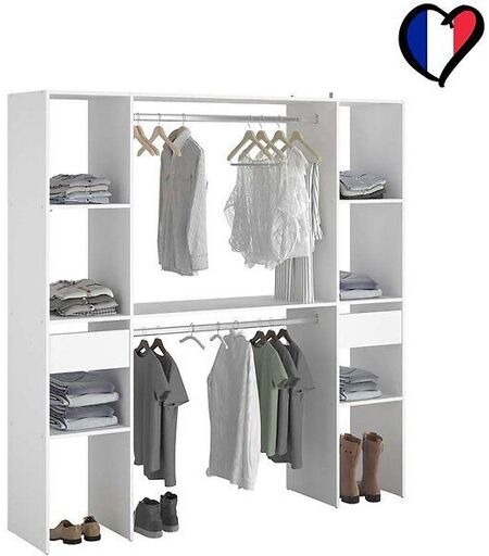 Cet élégant dressing blanc fabriqué en France sera parfait pour ranger, organiser votre garde-robe comme il faut grâce à ses nombreux rangements. Il se compose de 6 étagères de 35 cm, 2 tiroirs de 35 cm et de 2 penderies parfait pour pendre vos manteaux, robes ou encore costumes. Ce dressing est pratique tout en étant élégant. Caractéristiques techniques : Couleur principale: Blanc Structure du meubles : Panneau de particules 15 mm Type de finitions : Mélaminé Nombre de colonnes : 2 Types de rangements: 6 étagères, 1 tiroir et 2 penderies 6 étagères de 35cm 2 tiroir 35cm 2 tubes de penderies de 100cm 6 étagères de 35cm 2 tiroir 35cm 2 tubes de penderies de 100cm Matière tube penderie : Acier galvanisé Extensible : non Fabriqué en France Entretien : Utiliser uniquement un chiffon doux légèrement humide. Ne pas utiliser de solvant. Dimensions : Dimensions totales : 180 x 39,9 x 180,4 cm Dimensions des colonnes : 180 x 38 x 40 cm Dimension du tiroir : 32,7 x 29,9 x 12 cm Dimensions des étagères : 35 x 40 cm Dimensions des tubes de penderie : 100 cm Epaisseur des panneaux : 15 mm Poids total : 54,6 kg Conditionnement : Produit livré dans 2 cartons. Montage facile, notice incluse. Colis 1 : 190,3 x 41,2 x 8,4 cm / 27,3 kg Colis 2 : 190,3 x 41,2 x 8,4 cm / 27,3 kg * Livraison pas de porte * Garantie 2 ans ...