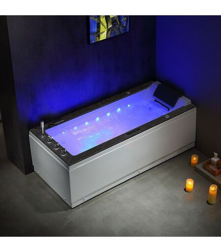 Description générale La baignoire rectangulaire Lord solo 1 place Archipel® offre une expérience de balnéothérapie unique grâce à son système de massage performant. Avec ses buses stratégiquement placées, elle permet un massage complet pour soulager les tensions musculaires, tout en intégrant un mitigeur 100 % sécurisé. Equipée d'un réchauffeur d'eau et d'un générateur d'ozone, cette baignoire assure un confort optimal lors de chaque utilisation. Spécifications techniques Dimensions (L x l x H) : 1700 x 750 x 635 mm Poids à vide : 110 kg Puissance maximale : 3300 watts Voltage : 220V - 16A Pompe de massage : 1 x 2HP (1500 W) Volume d’eau : Min : 170L / Max : 220L Réchauffeur d'eau : 1500 watts Matériaux : Acrylique pur de 4.5 mm d'épaisseur Joints de massage : 39 (25 jets d'eau et 10 jets d'air + 4 petits jets avec LED) Robinetterie en laiton massif avec mitigeur mécanique Panneau de commande tactile et radio FM Fonction Bluetooth intégrée Générateur d'ozone Certificats : TUV et ...