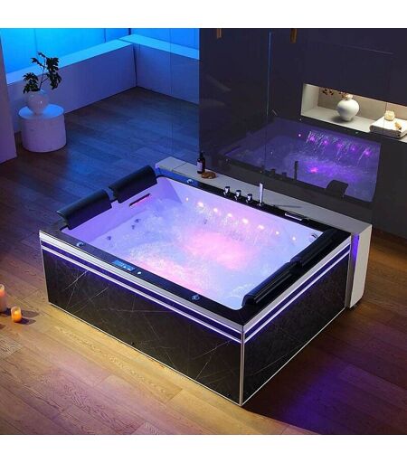 Nouveauté OCTOBRE 2023 Baignoire balnéo thérapeutique Archipel® ALTESS DUO BLACK 190x140 cm La nouvelle baignoire thérapeutique & design by Archipel ® Dimensions : 190*140*70h cm 3 Tabliers effet marbre noir de 6-7mm d'épaisseur en acrylique avec double bandeau LED intégré. 2 pompes de massage LX WHIRLPOOL® de 1490 Watts (2*2 HP) soit 2980 Watts 1 blower air puissant de 700W (bain à remous) Réchauffeur d'eau intégré : 1500 watts (pour maintenir la température de l'eau) Volume d'eau : Min 550L / Max : 600L Total puissance : 5200 watts (220V - 25A) 50 jets de massage : 30 jets de massage eau + air (effet venturi) 20 jets d'air dont 6 lumineux Contours en pierre noire reconstituée Jets de massage en matériaux mixtes ABS/ Acier Inoxydable. Buse Air en ABS finition chromée argentée. Tabliers en pierre artificiel effet marbre avec 1 double bandeau de lumière LED bleu intégrée sur les 3 tabliers (circuit Led indépendant avec interrupteur en façade). Chromothérapie LED intérieure : 16 leds ...