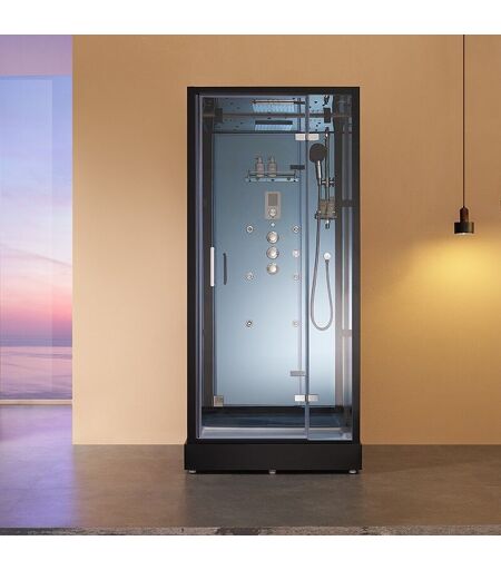 Cabine douche hammam X-ONE MIROIR BLEU Archipel® - 100x90 cm Conception Archipel® 2025 : Véritable cabine de douche multifonction, le modèle X-ONE Archipel® combine une fonction hammam performante, des jets hydromassants, et des équipements novateurs de série (ciel étoilé, Bluetooth,...) Dimensions hors tout : 100*90*223 cm - Collection disponible en 3 finitions (miroir, miroir bleuté, black). Douchette à main HANSGROHE® 3 jets Pulsify Blend Select incluses. FONCTIONS EXCLUSIVES Mitigeur thermostatique en laiton chromé Douchette à main de marque allemande HANSGROHE® 3 jets Pulsify Blend Select Douche de pluie indépendante 6 jets hydromassants DÉTAIL DE LA STRUCTURE Dimensions hors tout en millimètres : 100*90*2230. Siège non inclu (plusieurs types de sièges sont en vente sur notre site) Receveur en acrylique renforcé par couches de fibre de verre Châssis en acier avec pieds réglables, Vitre fixe et porte vitrée en verre securit ESG 6mm verre trempé de sécurité résistant aux chocs, ...