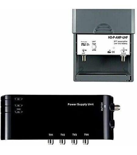 Kit préamplificateur + alimentation 4 sorties pour augmenter la qualité de signal de votre antenne terrestre et connecter jusqu'à 4 TV Idéal en cas de réception difficile, il permet d'augmenter la qualité de votre signal terrestre afin de pouvoir recevoir plus de chaines et/ou d'améliorer la qualité de vos chaines. Ce boîtier d'intérieur améliore le signal de votre antenne et le répartit vers 4 téléviseurs maximum. Il peut être utilisé en complément d'un préamplificateur pour une meilleure efficacité. Compatible avec la TNT HD.- Nombre de sorties : 4 - Fréquence : 47 - 862 MHz - Perte insertion : 2 - 8 dB - Connecteurs : Femelle F - Alimentation : 220V AC / 50Hz - Sortie : 12V DC 100mA (max) ...