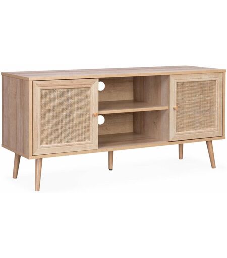 Sweeek Meuble Tv En Cannage 120x39x56.5cm - Bohème - Naturel. 2 Niveaux. 2 Étagères. 2 Portes. Pieds
