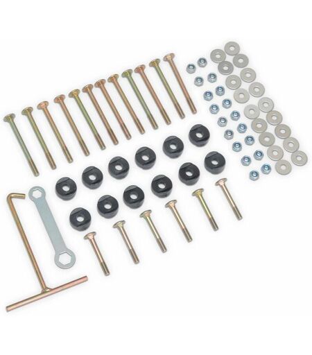 Les + produit Pièces d’origine sweeek (anciennement sweeek) parfaitement compatibles Remplacez facilement la visserie de votre trampoline avec ce set de vis (filet intérieur ou extérieur). Ce pack contient : - 12 vis de fixation - 12 entretoises - 12 rondelles - 12 écrous auto bloquants - 6 vis pour pieds en U - 6 rondelles pour pieds en U - 6 écrous auto bloquants pour pieds en U - 1 tendeur de ressorts - 1 outil Compatibilité : La compatibilité est garantie sur la totalité des trampolines commercialisés de 2016 à aujourd'hui. En cas de doute, vous pouvez contacter notre service clientèle. Information complémentaire Selon la taille de votre trampoline, un ou deux sets de vis seront nécessaires. ...
