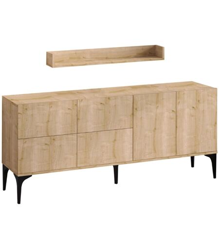 Ensemble buffet et étagère murale chêne clair Transformez votre intérieur avec notre ensemble étagère murale et buffet en bois. Le buffet, imitation chêne clair clair, offre cinq étagères avec portes, parfait pour un rangement discret et élégant. Complétez votre décoration avec l'étagère murale assortie, idéale pour exposer vos objets préférés. Ce duo harmonieux combine fonctionnalité et style pour une pièce à vivre chaleureuse et moderne. Caractéristiques techniques Couleur principale : Chêne clair Couleur secondaire : Noir Structure : Panneaux de particules Finition : Mélaminé Type de rangements : 5 étagères avec portes Poids total : 52 kg Nombre de pieds : 5 Entretien Nettoyer avec un chiffon légèrement humide, éviter les produits contenant des solvants. Dimensions Dimension totale : 186 x 44 x 33 cm Hauteur des pieds : 25 cm Dimensions des portes : 45 x 55 x 40 cm x2 45 x 22.5 x 40 cm x2 Conditionnement Le produit est conditionné dans 2 colis : 186 x 44 x 12 cm / 39 kg 55 x 42 x 21 cm / 13 kg Montage facile une notice est fournie. Garantie 2 ans ...