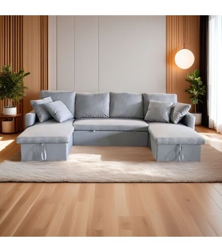 Canapé panoramique convertible 4 places en tissu avec coffre gris clair Ce canapé panoramique convertible gris clair allie élégance moderne et fonctionnalité ingénieuse. Conçu avec une structure en bois de lin et des pieds discrets, il offre à la fois robustesse et raffinement. Ses coussins amovibles et sa suspension à ressort garantissent un confort exceptionnel pour des moments de détente inégalés. Convertible, il dispose d¿un couchage spacieux de 267 x 110 x 44 cm, idéal pour accueillir confortablement deux personnes. Pratique, il est équipé de deux coffres de rangement sous les assises, parfaits pour ranger draps et couvertures et optimiser votre espace de vie. Capable de supporter jusqu¿à 250 kg, ce canapé est parfaitement adapté aux intérieurs contemporains. Facile à monter grâce à une notice claire et simple, il se nettoie sans effort avec un chiffon humide. L¿équilibre parfait entre confort, esthétisme et praticité. Caractéristiques techniques Nombre de places : 4 Couleur : Gris clair Matière de la structure : Cadre en bois de lin Matériel pieds : Plastique Matière : Tissu Convertible : Oui Nombre de coussins : 4 Type de rangement : Coffre Nombre de coffres : 2 Poids maximum supporté : 250 kg Entretien Utilisez un chiffon légèrement humide, pas de détergent. Dimensions Dimensions totales : 286 x 147 x 88 cm Dimension du couchage : 267 x 110 x 44 cm Poids total : 105 kg Hauteur pied : 2,5 cm Hauteur assise : 44 cm Profondeur assise : 47 cm Épaisseur d'assise : 10 cm Densité de l'assise : 20,4 kg/m³ Conditionnement Produit livré dans 3 colis : Colis 1 : 131 x 82 x 54 cm / 44.5 kg Colis 2 : 149 x 73 x 41 cm / 39.9 kg Colis 3 : 149 x 73 x 41 cm / 39.9 kg ...