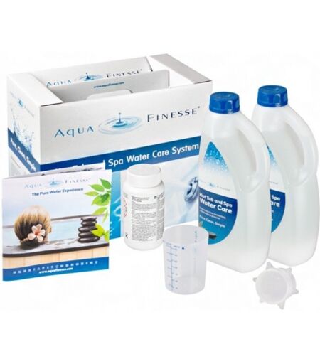 Kit Aquafinesse® : Un traitement tout en un ! Ce traitement multi-actions désinfecte l'eau de votre spa tout en ajustant le ph et l'alcalinité pour maintenir l'équilibre de l'eau. Atouts du traitement AquaFinesse® Traitement multi-actions durée de vie : 3 à 6 mois en fonction du volume d'eau eau douce et agréable Prend soin des canalisations Contenu du kit de traitement 2 bidons d'Aquafinesse de 2 Litres chacun 1 boîte de pastilles de chlore 1 diffuseur 1 récipient doseur 1 manuel d'utilisation Conseils d'utilisation Vous pouvez réaliser le traitement hebdomadaire en quelques étapes simples décrites dans le manuel d'utilisation fournit avec votre kit. Même si ce traitement est complet, il est recommandé de tester, une à plusieurs fois par semaine, l'eau de votre piscine. En effet, plusieurs facteurs tels que la fréquence de baignade ou la température du bassin, peuvent impacter l'équilibre de l'eau de votre spa. Pour garantir, un meilleur confort de baignade, ajuster régulièrement à l'aide d'un produit chimique adapté en fonction des résultats de votre test. ...