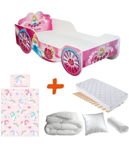 Princesse et carrosse : Ensemble lit complet 6 en 1 ! Le lit complet ! Votre enfant peut dormir dans son lit PRINCESSE ET CARROSSE dès que vous le recevez ! Vous aurez : Un lit en bois PRINCESSE ET SON CARROSSEUn sommier à lattes en boisUn matelas en mousseUn drap housseUn couette et un oreillerUne parure de lit assortie (licornes)Caractéristiques : 1) Lit PRINCESSE ET CARROSSE : Dimensions lit : Longueur 150 cm x Largeur 74cm x Hauteur 44 cmMatériaux : MDF (panneau de particules de bois)Sommier à lattes en bois(latte flexibles)Montage du lit : à monter soi-mêmeDimensions matelas : Longueur 140cm x Largeur 70cm x Hauteur 7cmComposition matelas : matelas en mousse avec une densité de 21k/m3Héros / Personnage : PRINCESSE ET CARROSSE Poids : 29 kgIdéal pour les fans des contes de fées et des princessesDescription : Un magnifique carrosse de couleur rose. Avec une princesse blonde portant une robe bleue. Le lit carrosse est décoré par plusieurs roses rouges.Fabriqué en Europe 2) Matelas : ...