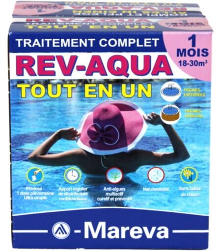 Points forts du Rev-Aqua Le produit de traitement Rev-Aqua par Mareva est un désinfectant mensuel tout en un et complet qui vous fera gagner un temps considérable ! Si vous rêviez d'une eau clair, cristalline et douce pour votre peau, n'attendez plus, le Rev-Aqua est ce qu'il vous faut. Pré-dosé : 4 doses hebdomadaires Apport régulier de désinfectant multifonctions Anti-algues multi-actif, curatif, préventif Non-moussant Sans odeur de chlore Caractéristiques du Mareva Rev-Aqua 4 sachets doseurs Pour piscine entre 18 et 30 m3 1 seule intervention par semaine Traitement multiactions : Anti-algues, anti-calcaire, désinfectant, clarifiant, floculant Produit à tenir hors de portée des enfants. Les produits biocides sont à utiliser avec précaution. Avant toute utilisation, lisez bien l'étiquette et la fiche de sécurité téléchargeable. ...