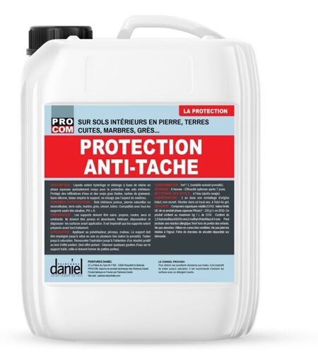 HYDROFUGE ANTI-TACHE HYDROFUGE OLÉOFUGE Protection Anti-tache PROCOM® Protection anti-tache est un produit de traitement hydrofuge et oléofuge en phase aqueuse sans silicone destiné à protéger les sols intérieurs et extérieurs des infiltrations d'eau et des taches de toute nature (huile, graisse...). Ce produit est incolore et non filmogène, il pénètre dans la porosité des matériaux tout en laissant respirer le support. Il s'applique sur tous matériaux poreux : Pierres naturelles et reconstituées, travertin, marbre, grès, granit, béton, terre cuite, pavés autobloquants, dallages béton. PROPRIÉTÉS Sans odeur, sans solvant. Effet perlant. Protège de l'eau, de l'huile et des graisses. Incolore, ne modifie ni la teinte, ni l'aspect d'origine. Non filmogène, ne forme aucun film en surface. Respect des matériaux, laisse respirer le support. Reste perméable à l'air et à la vapeur d'eau. Parfaite résistance aux UV. Ne jaunit pas. Facilite l'entretien des surfaces. Rallonge la durée de vie ...