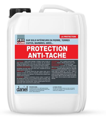 HYDROFUGE ANTI-TACHE HYDROFUGE OLÉOFUGE Protection Anti-tache PROCOM® Protection anti-tache est un produit de traitement hydrofuge et oléofuge en phase aqueuse sans silicone destiné à protéger les sols intérieurs et extérieurs des infiltrations d'eau et des taches de toute nature (huile, graisse...). Ce produit est incolore et non filmogène, il pénètre dans la porosité des matériaux tout en laissant respirer le support. Il s'applique sur tous matériaux poreux : Pierres naturelles et reconstituées, travertin, marbre, grès, granit, béton, terre cuite, pavés autobloquants, dallages béton. PROPRIÉTÉS Sans odeur, sans solvant. Effet perlant. Protège de l'eau, de l'huile et des graisses. Incolore, ne modifie ni la teinte, ni l'aspect d'origine. Non filmogène, ne forme aucun film en surface. Respect des matériaux, laisse respirer le support. Reste perméable à l'air et à la vapeur d'eau. Parfaite résistance aux UV. Ne jaunit pas. Facilite l'entretien des surfaces. Rallonge la durée de vie ...