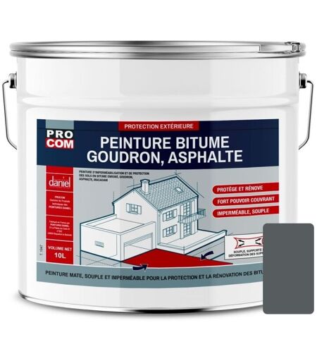 PEINTURE BITUME, BETON SOL EXTERIEUR Peinture bitume, goudron, asphalte PROCOM® La peinture bitume PROCOM est une peinture spécialement formulée pour la rénovation des bitumes enrobés et sols en asphalte, macadam et goudron. Elle permet de réaliser la mise en peinture de grandes surfaces ou le traçage au sol. Peinture Bitume est un produit de la gamme PROCOM, marque de peintures et revêtements techniques des Peintures Daniel. PROPRIETES Fort pouvoir couvrant Haute protection, protège les bitumes enrobés, retarde le vieillissement Imperméable à l'eau. Résistant aux intempéries. Excellente résistance aux UV (aucun ramollissement) Résistant à l'abrasion. Revêtement souple, suit les déformations du support. Prêt à l'emploi, application facile (pinceau, rouleau, brosse). N'abîme pas le bitume à l'inverse des peintures solvantées. Sans odeur. Finition mate, anti-réfléchissant. Antidérapant. DOMAINES D'APPLICATIONS Utilisation : Garages, parkings privatifs, allées, pistes cyclables, aires ...