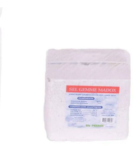 Bloc Sel gemme tout animal, complément alimentaire 10kg Bloc sel gemme Madox tout animal. Utilisation : Cette pierre à sel est un aliment complémentaire minéral à lécher pour bovins, équins, ovins et caprins. Ingrédients : Chlorure de sodium, insolubles et sulfates. Constituants analytiques : Sodium : 38% Calcium : 0,5% Potassium : 0,15% Magnésium : 0,07% Présentation : Bloc de 10 kg ...