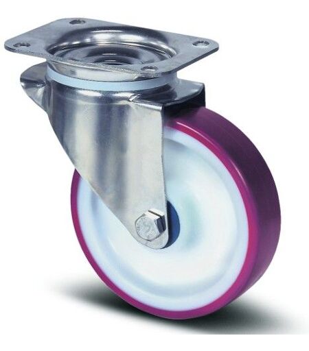 Roulette pivotante en inox Usage environnement alimentaire Roulements à rouleaux inox Fixation à platine Bandage:Polyuréthane Charge:150 kg Diamètre de la roue:100 mm Diamètre des trous:9 mm Dimension de la platine:105 x 85 mm Distance entre axe:80/77 x 60 mm Déport:41 mm Fixation:A platine Gamme:Alpha Hauteur:128 mm Largeur bande de roulement:32 mm Marque:TENTE Monture:Roulette pivotante Roulement:Roulement rouleaux Résistance à la température:- 40 / + 80 °C Usage:Milieu alimentaire ...