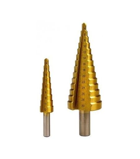 Lot de 2 Fraises étagées coniques acier HSS plaqué titane pour une résistance accrue Spécialement étudiés pour travailler les matériaux de faible épaisseur (5 à7 mm) ou d'effectuer des avant-trous Permet des perçages rapides et progressifs à différents diamètres Capable de percer dans la plupart des matériaux : métal, bois, plastique, tôle, etc... Lot comprenant : - 1 foret de Ø 4 à 30 mm par pas de 2 mm - 1 foret de Ø 4 à 12 mm par pas de 1 mm ...