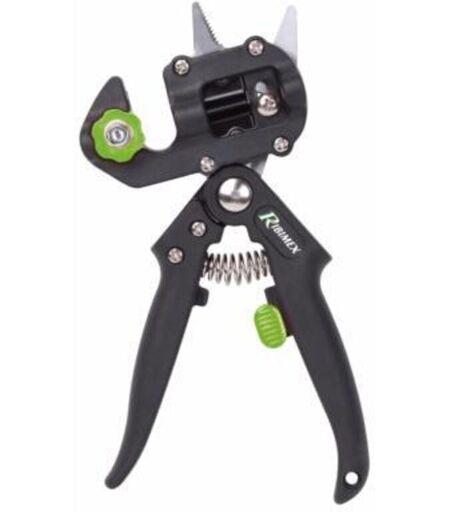 Pince à greffer toutes sortes d'arbustes ou de fruitiers Cette pince permet des greffes en V et en U sur des branches Ø 12 mm max Elle est équipée d'une partie sécateur à contre-lame crantée pour couper les tiges à greffer Fournie avec 3 lames et un butoir de lame supplémentaire Partie sécateur et support de lame en acier +- 3.4 mm d'épaisseur Ressort en inox Manche et tête de lame en nylon avec butée de blocage ...